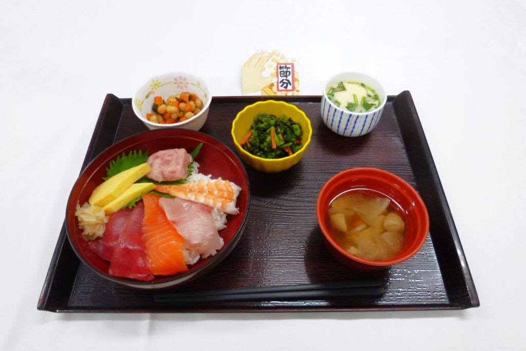 節分行事食 海鮮丼・茶わん蒸し・五目豆・鰯のつみれ汁です。