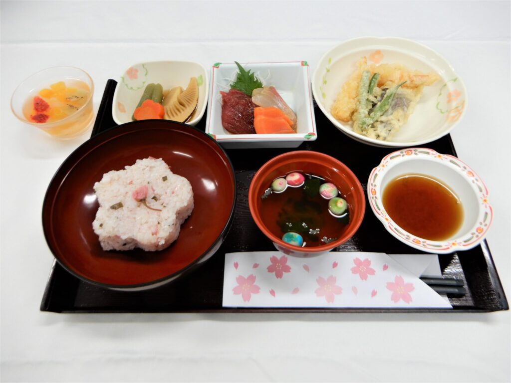 開所記念にお祝い御膳を召し上がって頂きました。桜ご飯、お刺身、天婦羅、炊合せ、清まし汁、フルーツゼリーです。