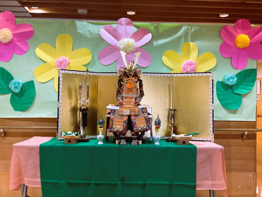 正面玄関入口に鯉のぼり・兜を飾りましたので是非面会時に観て下さい。